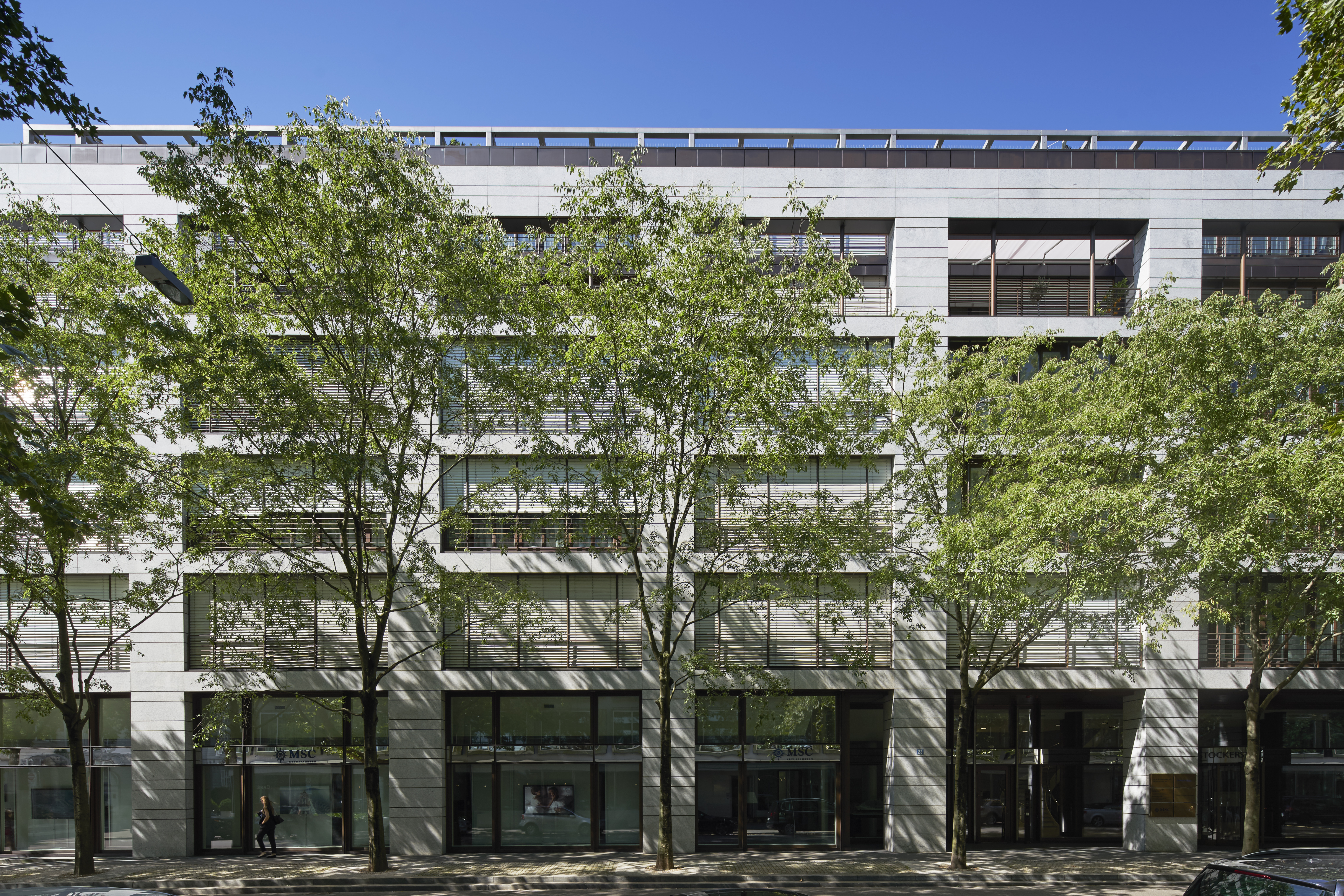 Die Fassade besteht aus Natursteinplatten, unterbrochen durch bronzene Fugenprofile. Auch Fensterfronten, Rollladenführungen sowie die Geländer und Querstangen sind in Bronze gehalten.