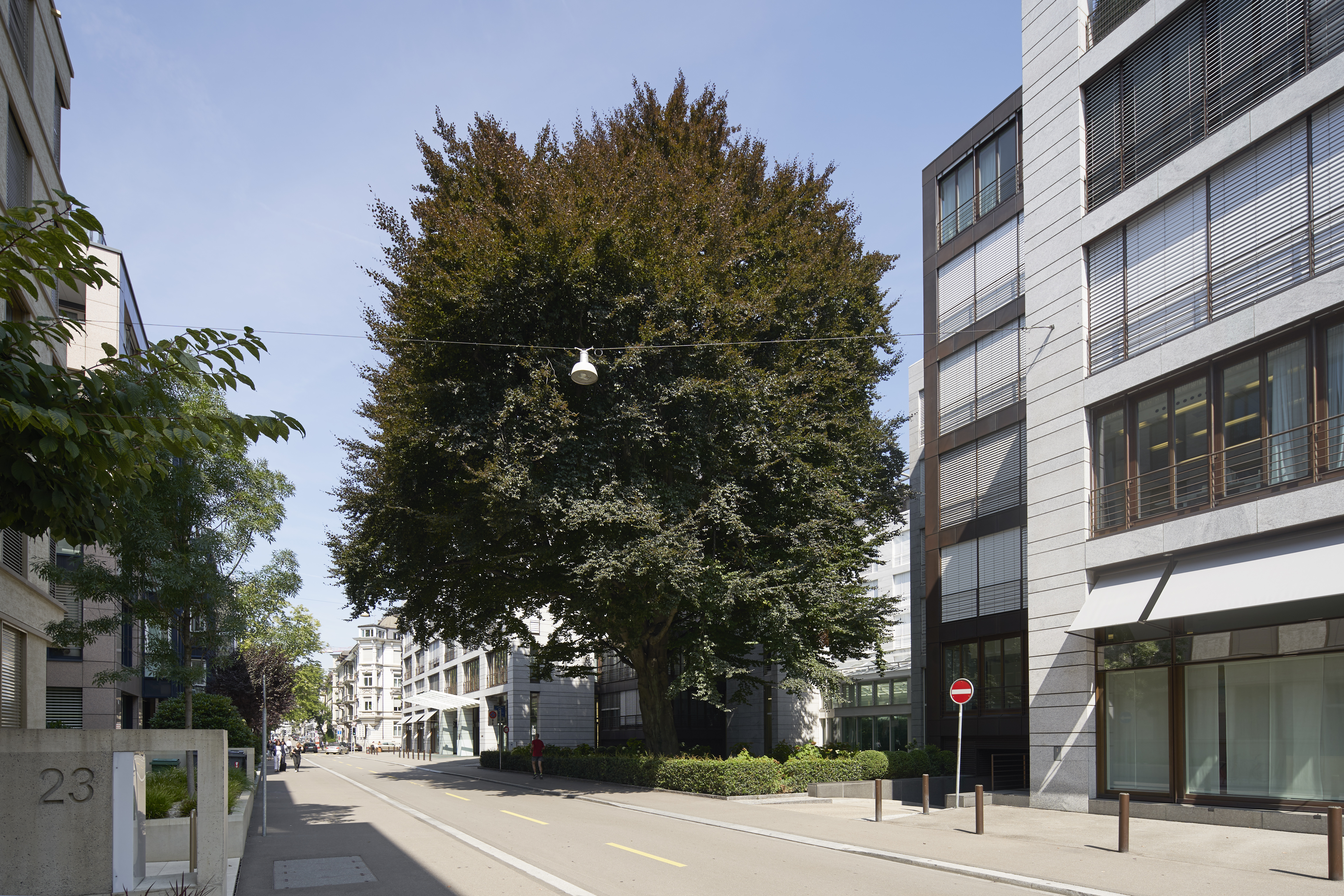 Das Projekt lehnt sich konzeptionell an traditionelle Bauten wie das Rote oder Weisse Schloss oder auch die Bodmerhöfe an. Das Prinzip der Blockrandbebauung, wie es mit der Festlegung der Strassenzüge vor hundert Jahren vorgezeichnet wurde, ist mit den heutigen konstruktiven Möglichkeiten neu umgesetzt. Der moderne „Skelettbau“ tritt anstelle des früheren muralen Aufbaus der Gebäude. Die grosszügigen Raumhöhen entsprechen denjenigen entlang der Bahnhofstrasse, und die Geschosse sind dank horizontaler Gliederung der hellen Natursteinfassade gut ablesbar. Edle Materialien bestimmen das Erscheinungsbild dieses modernen Bauwerkes. Die Proportionen des Baukörpers und der Fassade sind ausgewogen, statisch in sich ruhend.